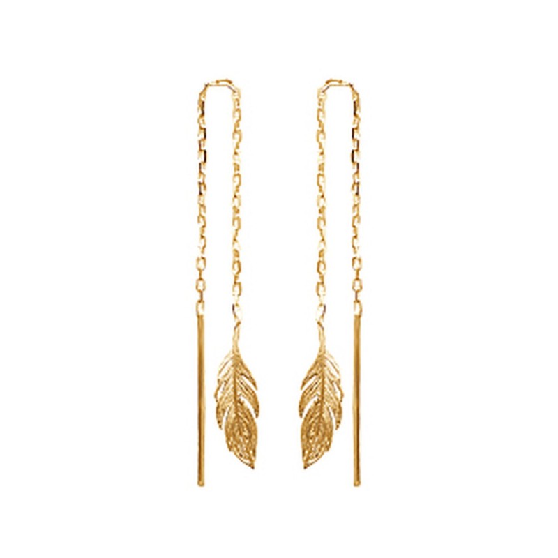 Boucles d'oreilles longues en plaqué or plume ciselée fermoir chainette