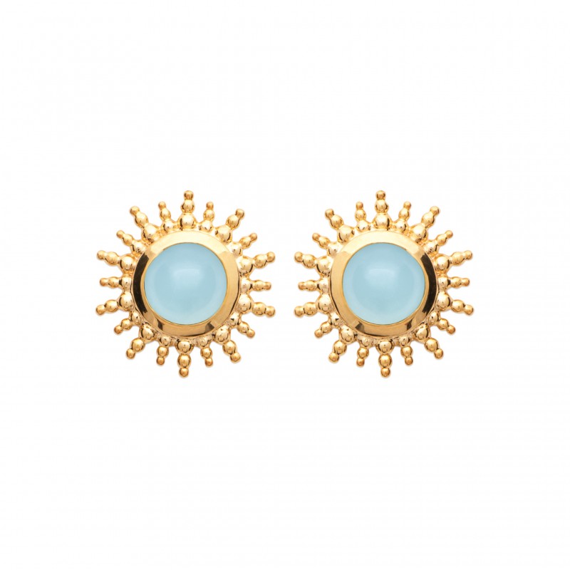 Vous ne resterez pas insensible à cette paire de boucles d'oreilles puces en plaqué or motif soleil irisé et d'une agate bleue véritable forme cabochon