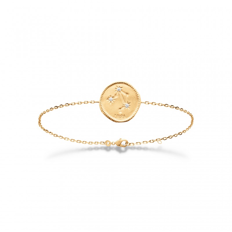 Vous ne resterez pas insensible à ce bracelet en plaqué or médaille au style artisanal représentant une constellation du signe du zodiaque " Balance "( Libra en latin ) pavé de pierres en oxydes de zirconium