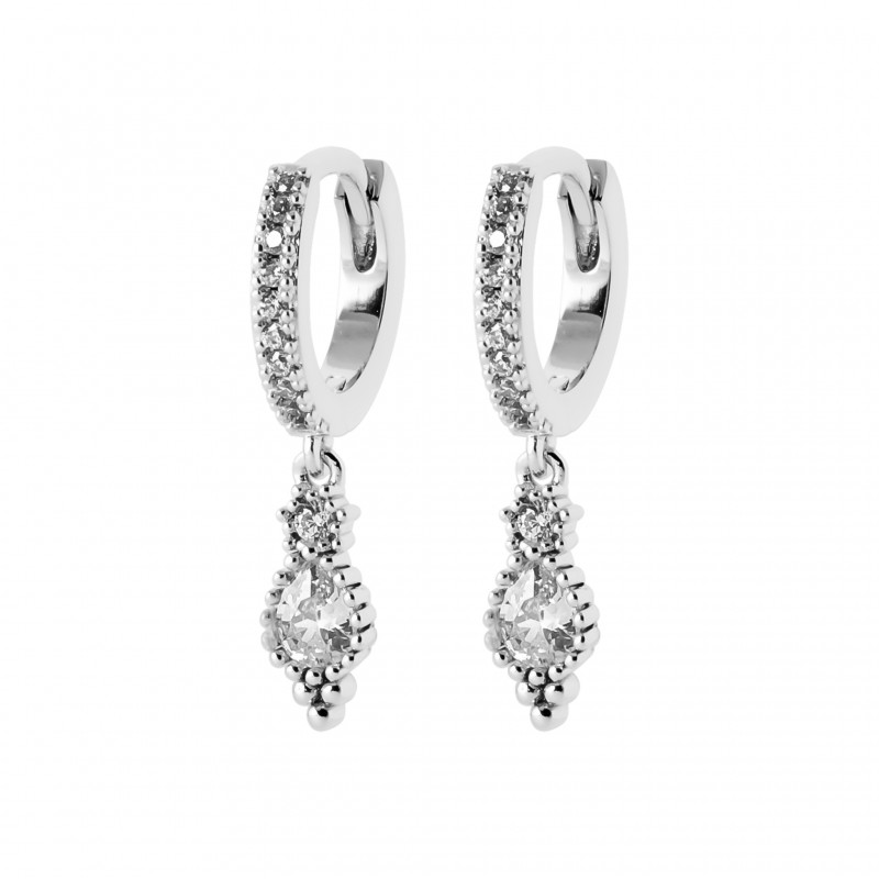 Vous ne pourrez plus vous passer de cette magnifique paire de mini créoles femme en argent massif avec une petite pampille la forme finement ciselée pierres sertis clos en oxyde de zirconium blanc.