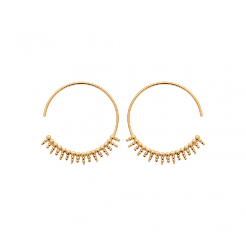 Elégante créoles en plaqué or anneaux contours petits picots perlés, fermoir de type crochet