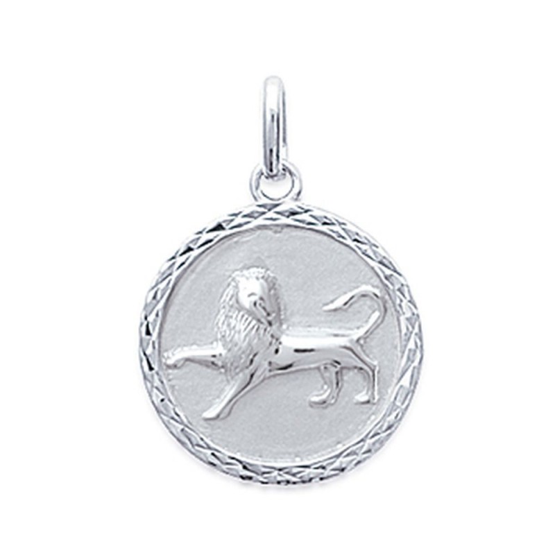 Pendentif en argent 925/1000 rhodié médaille signe lion contour ciselé signe astrologique zodiaque.