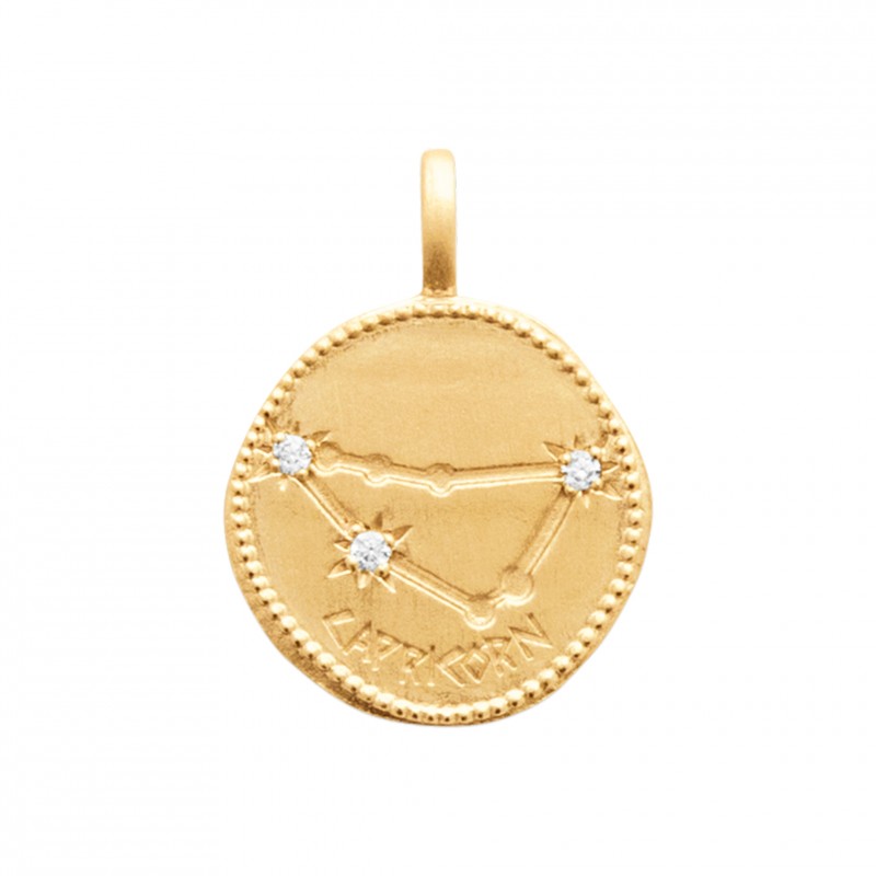 Vous ne resterez pas insensible à ce pendentif en plaqué or médaille au style artisanal représentant une constellation du signe du zodiaque " Capricorne "( Capricorn en latin ) pavé de pierres en oxydes de zirconium