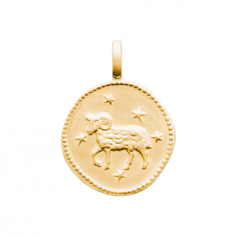 Pendentif en plaqué or médaille ronde ciselée signe Bélier astrologique zodiaque.